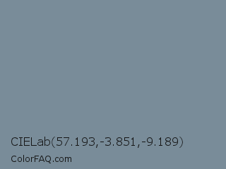 CIELab 57.193,-3.851,-9.189 Color is a normal blue color and the nearest color is Light Slate Gray #778899. Hex code #798c99 and RGB value is rgb(121,140,153). In RGB color space, this color is composed of 47% red, 55% green, 60% blue, In CMYK color space, this color is composed of 21% cyan, 8% magenta, 0% yellow , 40% black , In HSL color space, this color has a hue angle of 204° , 14% saturation and 54% lightness.