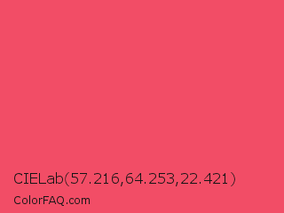 CIELab 57.216,64.253,22.421 Color is a light red color and the nearest color is Infra Red #ff496c. Hex code #f24d66 and RGB value is rgb(242,77,102). In RGB color space, this color is composed of 95% red, 30% green, 40% blue, In CMYK color space, this color is composed of 0% cyan, 68% magenta, 58% yellow , 5% black , In HSL color space, this color has a hue angle of 351° , 86% saturation and 63% lightness.