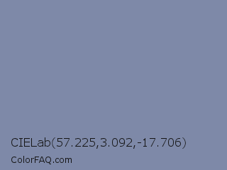 CIELab 57.225,3.092,-17.706 Color is a normal blue color and the nearest color is Shadow Blue #778ba5. Hex code #7e89a8 and RGB value is rgb(126,137,168). In RGB color space, this color is composed of 49% red, 54% green, 66% blue, In CMYK color space, this color is composed of 25% cyan, 18% magenta, 0% yellow , 34% black , In HSL color space, this color has a hue angle of 224° , 19% saturation and 58% lightness.