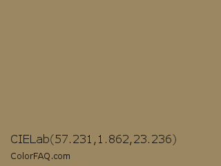 CIELab 57.231,1.862,23.236 Color is a normal orange color and the nearest color is Barley Corn #a68b5b. Hex code #9b8761 and RGB value is rgb(155,135,97). In RGB color space, this color is composed of 61% red, 53% green, 38% blue, In CMYK color space, this color is composed of 0% cyan, 13% magenta, 37% yellow , 39% black , In HSL color space, this color has a hue angle of 39° , 23% saturation and 49% lightness.