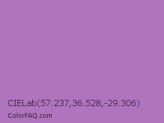 CIELab 57.237,36.528,-29.306 Color is a normal purple color and the nearest color is African Violet #b284be. Hex code #b073bd and RGB value is rgb(176,115,189). In RGB color space, this color is composed of 69% red, 45% green, 74% blue, In CMYK color space, this color is composed of 7% cyan, 39% magenta, 0% yellow , 26% black , In HSL color space, this color has a hue angle of 289° , 36% saturation and 60% lightness.