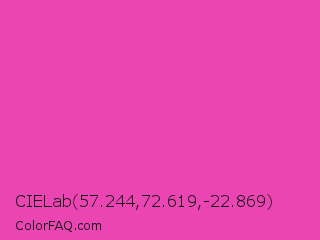 CIELab 57.244,72.619,-22.869 Color is a normal magenta color and the nearest color is Frostbite #e936a7. Hex code #eb45b3 and RGB value is rgb(235,69,179). In RGB color space, this color is composed of 92% red, 27% green, 70% blue, In CMYK color space, this color is composed of 0% cyan, 71% magenta, 24% yellow , 8% black , In HSL color space, this color has a hue angle of 320° , 81% saturation and 60% lightness.