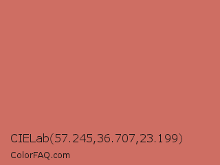 CIELab 57.245,36.707,23.199 Color is a normal red color and the nearest color is Fuzzy Wuzzy #cc6666. Hex code #ce6e63 and RGB value is rgb(206,110,99). In RGB color space, this color is composed of 81% red, 43% green, 39% blue, In CMYK color space, this color is composed of 0% cyan, 47% magenta, 52% yellow , 19% black , In HSL color space, this color has a hue angle of 6° , 52% saturation and 60% lightness.