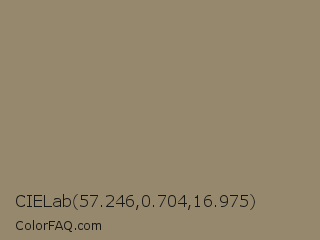 CIELab 57.246,0.704,16.975 Color is a normal orange color and the nearest color is Arrowtown #948771. Hex code #96886c and RGB value is rgb(150,136,108). In RGB color space, this color is composed of 59% red, 53% green, 42% blue, In CMYK color space, this color is composed of 0% cyan, 9% magenta, 28% yellow , 41% black , In HSL color space, this color has a hue angle of 40° , 17% saturation and 51% lightness.