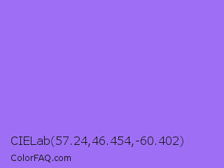CIELab 57.24,46.454,-60.402 Color is a light violet color and the nearest color is Medium Purple #9370db. Hex code #9e6ff4 and RGB value is rgb(158,111,244). In RGB color space, this color is composed of 62% red, 44% green, 96% blue, In CMYK color space, this color is composed of 35% cyan, 55% magenta, 0% yellow , 4% black , In HSL color space, this color has a hue angle of 261° , 86% saturation and 70% lightness.