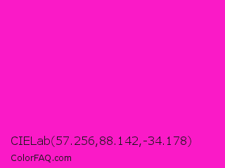 CIELab 57.256,88.142,-34.178 Color is a normal magenta color and the nearest color is Hot Magenta #ff1dce. Hex code #fa1ac7 and RGB value is rgb(250,26,199). In RGB color space, this color is composed of 98% red, 10% green, 78% blue, In CMYK color space, this color is composed of 0% cyan, 90% magenta, 20% yellow , 2% black , In HSL color space, this color has a hue angle of 314° , 96% saturation and 54% lightness.