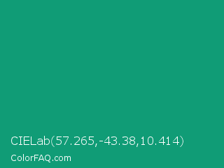 CIELab 57.265,-43.38,10.414 Color is a normal cyan color and the nearest color is Gossamer #069b81. Hex code #109c76 and RGB value is rgb(16,156,118). In RGB color space, this color is composed of 6% red, 61% green, 46% blue, In CMYK color space, this color is composed of 90% cyan, 0% magenta, 24% yellow , 39% black , In HSL color space, this color has a hue angle of 164° , 81% saturation and 34% lightness.