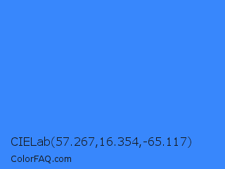 CIELab 57.267,16.354,-65.117 Color is a normal blue color and the nearest color is Brilliant Azure #3399ff. Hex code #3887fc and RGB value is rgb(56,135,252). In RGB color space, this color is composed of 22% red, 53% green, 99% blue, In CMYK color space, this color is composed of 78% cyan, 46% magenta, 0% yellow , 1% black , In HSL color space, this color has a hue angle of 216° , 97% saturation and 60% lightness.