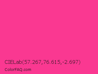 CIELab 57.267,76.615,-2.697 Color is a normal rose color and the nearest color is French Fuchsia #fd3f92. Hex code #fa3891 and RGB value is rgb(250,56,145). In RGB color space, this color is composed of 98% red, 22% green, 57% blue, In CMYK color space, this color is composed of 0% cyan, 78% magenta, 42% yellow , 2% black , In HSL color space, this color has a hue angle of 332° , 95% saturation and 60% lightness.