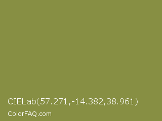 CIELab 57.271,-14.382,38.961 Color is a normal yellow color and the nearest color is Sycamore #908d39. Hex code #878f43 and RGB value is rgb(135,143,67). In RGB color space, this color is composed of 53% red, 56% green, 26% blue, In CMYK color space, this color is composed of 6% cyan, 0% magenta, 53% yellow , 44% black , In HSL color space, this color has a hue angle of 66° , 36% saturation and 41% lightness.