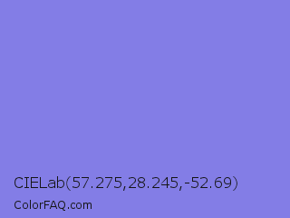 CIELab 57.275,28.245,-52.69 Color is a light indigo color and the nearest color is Chetwode Blue #8581d9. Hex code #837de6 and RGB value is rgb(131,125,230). In RGB color space, this color is composed of 51% red, 49% green, 90% blue, In CMYK color space, this color is composed of 43% cyan, 46% magenta, 0% yellow , 10% black , In HSL color space, this color has a hue angle of 243° , 68% saturation and 70% lightness.