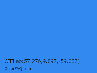 CIELab 57.276,9.897,-59.037 Color is a normal blue color and the nearest color is Bleu De France #318ce7. Hex code #328af1 and RGB value is rgb(50,138,241). In RGB color space, this color is composed of 20% red, 54% green, 95% blue, In CMYK color space, this color is composed of 79% cyan, 43% magenta, 0% yellow , 5% black , In HSL color space, this color has a hue angle of 212° , 87% saturation and 57% lightness.