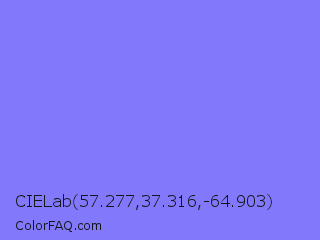 CIELab 57.277,37.316,-64.903 Color is a light indigo color and the nearest color is Medium Slate Blue #7b68ee. Hex code #8278fc and RGB value is rgb(130,120,252). In RGB color space, this color is composed of 51% red, 47% green, 99% blue, In CMYK color space, this color is composed of 48% cyan, 52% magenta, 0% yellow , 1% black , In HSL color space, this color has a hue angle of 245° , 96% saturation and 73% lightness.