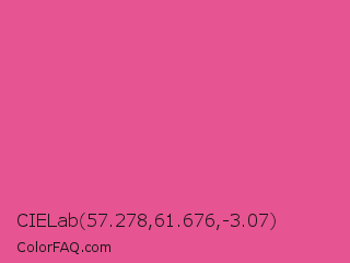 CIELab 57.278,61.676,-3.07 Color is a light rose color and the nearest color is Raspberry Pink #e25098. Hex code #e65491 and RGB value is rgb(230,84,145). In RGB color space, this color is composed of 90% red, 33% green, 57% blue, In CMYK color space, this color is composed of 0% cyan, 63% magenta, 37% yellow , 10% black , In HSL color space, this color has a hue angle of 335° , 74% saturation and 62% lightness.