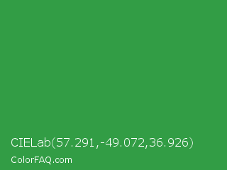 CIELab 57.291,-49.072,36.926 Color is a normal green color and the nearest color is Sea Green #2e8b57. Hex code #329d45 and RGB value is rgb(50,157,69). In RGB color space, this color is composed of 20% red, 62% green, 27% blue, In CMYK color space, this color is composed of 68% cyan, 0% magenta, 56% yellow , 38% black , In HSL color space, this color has a hue angle of 131° , 52% saturation and 41% lightness.
