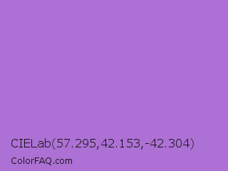 CIELab 57.295,42.153,-42.304 Color is a light purple color and the nearest color is Rich Lavender #a76bcf. Hex code #ad70d4 and RGB value is rgb(173,112,212). In RGB color space, this color is composed of 68% red, 44% green, 83% blue, In CMYK color space, this color is composed of 18% cyan, 47% magenta, 0% yellow , 17% black , In HSL color space, this color has a hue angle of 277° , 54% saturation and 64% lightness.
