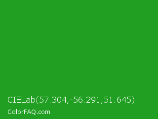 CIELab 57.304,-56.291,51.645 Color is a normal green color and the nearest color is Slimy Green #299617. Hex code #219f22 and RGB value is rgb(33,159,34). In RGB color space, this color is composed of 13% red, 62% green, 13% blue, In CMYK color space, this color is composed of 79% cyan, 0% magenta, 79% yellow , 38% black , In HSL color space, this color has a hue angle of 120° , 66% saturation and 38% lightness.