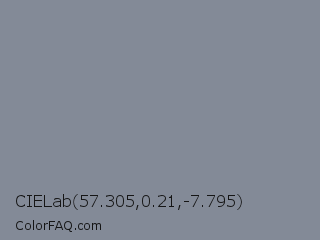 CIELab 57.305,0.21,-7.795 Color is a normal blue color and the nearest color is Roman Silver #838996. Hex code #838a97 and RGB value is rgb(131,138,151). In RGB color space, this color is composed of 51% red, 54% green, 59% blue, In CMYK color space, this color is composed of 13% cyan, 9% magenta, 0% yellow , 41% black , In HSL color space, this color has a hue angle of 219° , 9% saturation and 55% lightness.