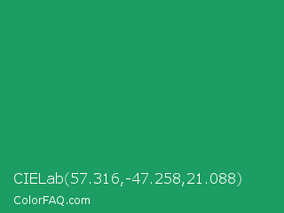 CIELab 57.316,-47.258,21.088 Color is a normal green color and the nearest color is Eucalyptus #278a5b. Hex code #1b9d63 and RGB value is rgb(27,157,99). In RGB color space, this color is composed of 11% red, 62% green, 39% blue, In CMYK color space, this color is composed of 83% cyan, 0% magenta, 37% yellow , 38% black , In HSL color space, this color has a hue angle of 153° , 71% saturation and 36% lightness.