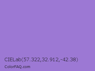 CIELab 57.322,32.912,-42.38 Color is a light violet color and the nearest color is Lilac Bush #9874d3. Hex code #9c78d4 and RGB value is rgb(156,120,212). In RGB color space, this color is composed of 61% red, 47% green, 83% blue, In CMYK color space, this color is composed of 26% cyan, 43% magenta, 0% yellow , 17% black , In HSL color space, this color has a hue angle of 263° , 52% saturation and 65% lightness.