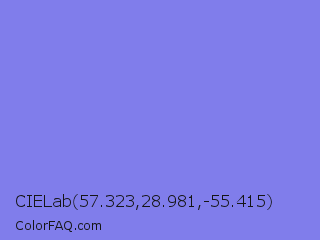 CIELab 57.323,28.981,-55.415 Color is a light indigo color and the nearest color is Chetwode Blue #8581d9. Hex code #807deb and RGB value is rgb(128,125,235). In RGB color space, this color is composed of 50% red, 49% green, 92% blue, In CMYK color space, this color is composed of 46% cyan, 47% magenta, 0% yellow , 8% black , In HSL color space, this color has a hue angle of 242° , 73% saturation and 71% lightness.
