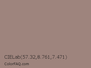 CIELab 57.32,8.761,7.471 Color is a normal red color and the nearest color is Pharlap #a3807b. Hex code #9e847d and RGB value is rgb(158,132,125). In RGB color space, this color is composed of 62% red, 52% green, 49% blue, In CMYK color space, this color is composed of 0% cyan, 16% magenta, 21% yellow , 38% black , In HSL color space, this color has a hue angle of 13° , 15% saturation and 55% lightness.