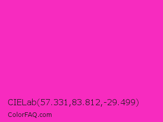 CIELab 57.331,83.812,-29.499 Color is a normal magenta color and the nearest color is Razzle Dazzle Rose #ff33cc. Hex code #f72bbf and RGB value is rgb(247,43,191). In RGB color space, this color is composed of 97% red, 17% green, 75% blue, In CMYK color space, this color is composed of 0% cyan, 83% magenta, 23% yellow , 3% black , In HSL color space, this color has a hue angle of 316° , 93% saturation and 57% lightness.