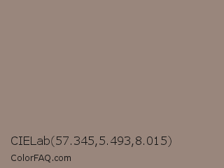 CIELab 57.345,5.493,8.015 Color is a normal orange color and the nearest color is Cinereous #98817b. Hex code #99867c and RGB value is rgb(153,134,124). In RGB color space, this color is composed of 60% red, 53% green, 49% blue, In CMYK color space, this color is composed of 0% cyan, 12% magenta, 19% yellow , 40% black , In HSL color space, this color has a hue angle of 21° , 12% saturation and 54% lightness.