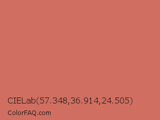 CIELab 57.348,36.914,24.505 Color is a normal red color and the nearest color is Fuzzy Wuzzy #cc6666. Hex code #cf6e61 and RGB value is rgb(207,110,97). In RGB color space, this color is composed of 81% red, 43% green, 38% blue, In CMYK color space, this color is composed of 0% cyan, 47% magenta, 53% yellow , 19% black , In HSL color space, this color has a hue angle of 7° , 53% saturation and 60% lightness.
