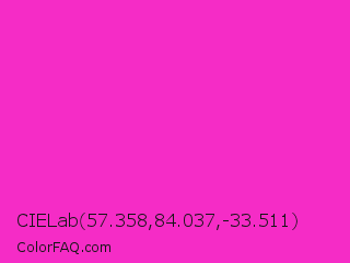 CIELab 57.358,84.037,-33.511 Color is a normal magenta color and the nearest color is Razzle Dazzle Rose #ff33cc. Hex code #f52cc6 and RGB value is rgb(245,44,198). In RGB color space, this color is composed of 96% red, 17% green, 78% blue, In CMYK color space, this color is composed of 0% cyan, 82% magenta, 19% yellow , 4% black , In HSL color space, this color has a hue angle of 314° , 91% saturation and 57% lightness.
