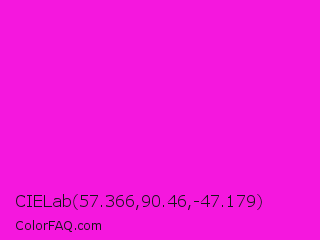 CIELab 57.366,90.46,-47.179 Color is a normal magenta color and the nearest color is Hot Magenta #ff1dce. Hex code #f517de and RGB value is rgb(245,23,222). In RGB color space, this color is composed of 96% red, 9% green, 87% blue, In CMYK color space, this color is composed of 0% cyan, 91% magenta, 9% yellow , 4% black , In HSL color space, this color has a hue angle of 306° , 92% saturation and 53% lightness.