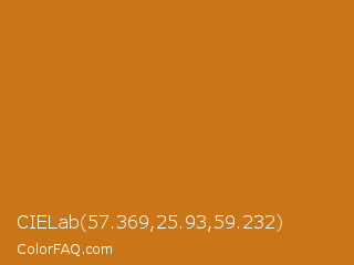 CIELab 57.369,25.93,59.232 Color is a normal orange color and the nearest color is Ochre #cc7722. Hex code #c87618 and RGB value is rgb(200,118,24). In RGB color space, this color is composed of 78% red, 46% green, 9% blue, In CMYK color space, this color is composed of 0% cyan, 41% magenta, 88% yellow , 22% black , In HSL color space, this color has a hue angle of 32° , 79% saturation and 44% lightness.