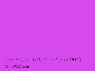 CIELab 57.374,74.771,-55.904 Color is a light magenta color and the nearest color is Medium Orchid #ba55d3. Hex code #d64aed and RGB value is rgb(214,74,237). In RGB color space, this color is composed of 84% red, 29% green, 93% blue, In CMYK color space, this color is composed of 10% cyan, 69% magenta, 0% yellow , 7% black , In HSL color space, this color has a hue angle of 292° , 82% saturation and 61% lightness.