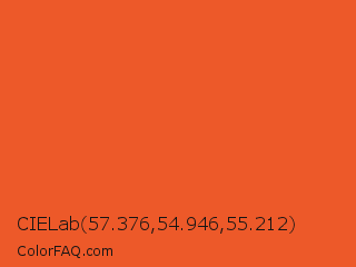 CIELab 57.376,54.946,55.212 Color is a normal color and the nearest color is Flamingo #f2552a. Hex code #ed5929 and RGB value is rgb(237,89,41). In RGB color space, this color is composed of 93% red, 35% green, 16% blue, In CMYK color space, this color is composed of 0% cyan, 62% magenta, 83% yellow , 7% black , In HSL color space, this color has a hue angle of 15° , 84% saturation and 55% lightness.
