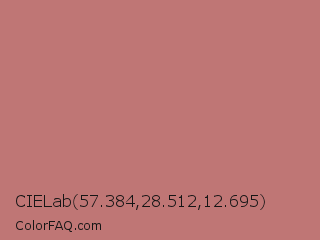 CIELab 57.384,28.512,12.695 Color is a normal red color and the nearest color is Rose Gold #b76e79. Hex code #bf7675 and RGB value is rgb(191,118,117). In RGB color space, this color is composed of 75% red, 46% green, 46% blue, In CMYK color space, this color is composed of 0% cyan, 38% magenta, 39% yellow , 25% black , In HSL color space, this color has a hue angle of 1° , 37% saturation and 60% lightness.