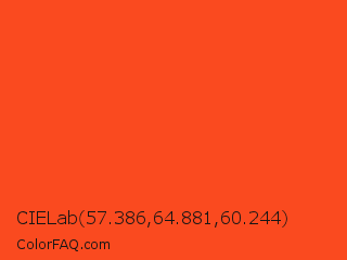 CIELab 57.386,64.881,60.244 Color is a normal red color and the nearest color is Pomegranate #f34723. Hex code #fa4a1f and RGB value is rgb(250,74,31). In RGB color space, this color is composed of 98% red, 29% green, 12% blue, In CMYK color space, this color is composed of 0% cyan, 70% magenta, 88% yellow , 2% black , In HSL color space, this color has a hue angle of 12° , 96% saturation and 55% lightness.
