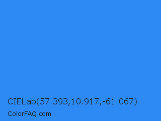 CIELab 57.393,10.917,-61.067 Color is a normal blue color and the nearest color is Bleu De France #318ce7. Hex code #2d8af5 and RGB value is rgb(45,138,245). In RGB color space, this color is composed of 18% red, 54% green, 96% blue, In CMYK color space, this color is composed of 82% cyan, 44% magenta, 0% yellow , 4% black , In HSL color space, this color has a hue angle of 212° , 91% saturation and 57% lightness.