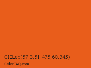CIELab 57.3,51.475,60.345 Color is a normal orange color and the nearest color is Vivid Vermilion #e56024. Hex code #e95d1b and RGB value is rgb(233,93,27). In RGB color space, this color is composed of 91% red, 36% green, 11% blue, In CMYK color space, this color is composed of 0% cyan, 60% magenta, 88% yellow , 9% black , In HSL color space, this color has a hue angle of 19° , 82% saturation and 51% lightness.