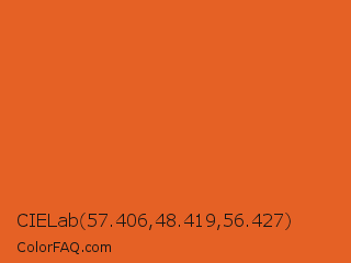 CIELab 57.406,48.419,56.427 Color is a normal orange color and the nearest color is Vivid Vermilion #e56024. Hex code #e56125 and RGB value is rgb(229,97,37). In RGB color space, this color is composed of 90% red, 38% green, 15% blue, In CMYK color space, this color is composed of 0% cyan, 58% magenta, 84% yellow , 10% black , In HSL color space, this color has a hue angle of 19° , 79% saturation and 52% lightness.