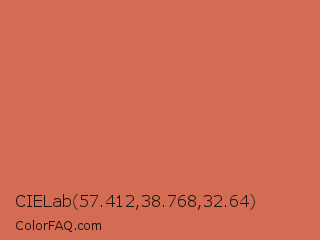 CIELab 57.412,38.768,32.64 Color is a normal red color and the nearest color is Copper Red #cb6d51. Hex code #d46c53 and RGB value is rgb(212,108,83). In RGB color space, this color is composed of 83% red, 42% green, 33% blue, In CMYK color space, this color is composed of 0% cyan, 49% magenta, 61% yellow , 17% black , In HSL color space, this color has a hue angle of 12° , 60% saturation and 58% lightness.