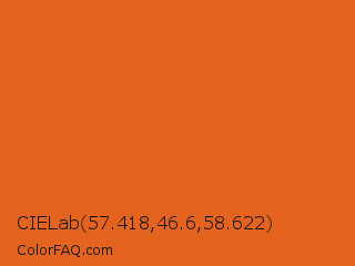 CIELab 57.418,46.6,58.622 Color is a normal orange color and the nearest color is Vivid Vermilion #e56024. Hex code #e3631f and RGB value is rgb(227,99,31). In RGB color space, this color is composed of 89% red, 39% green, 12% blue, In CMYK color space, this color is composed of 0% cyan, 56% magenta, 86% yellow , 11% black , In HSL color space, this color has a hue angle of 21° , 78% saturation and 51% lightness.