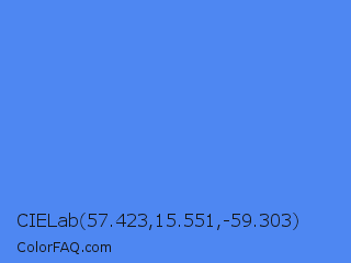 CIELab 57.423,15.551,-59.303 Color is a light blue color and the nearest color is Blueberry #4f86f7. Hex code #4e87f2 and RGB value is rgb(78,135,242). In RGB color space, this color is composed of 31% red, 53% green, 95% blue, In CMYK color space, this color is composed of 68% cyan, 44% magenta, 0% yellow , 5% black , In HSL color space, this color has a hue angle of 219° , 86% saturation and 63% lightness.