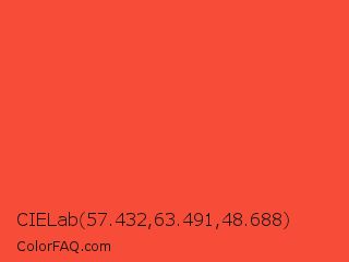 CIELab 57.432,63.491,48.688 Color is a normal red color and the nearest color is Sunset Orange #fe4c40. Hex code #f74d38 and RGB value is rgb(247,77,56). In RGB color space, this color is composed of 97% red, 30% green, 22% blue, In CMYK color space, this color is composed of 0% cyan, 69% magenta, 77% yellow , 3% black , In HSL color space, this color has a hue angle of 7° , 92% saturation and 59% lightness.