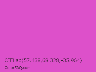 CIELab 57.438,68.328,-35.964 Color is a normal magenta color and the nearest color is Fuchsia Pink #c154c1. Hex code #dd50ca and RGB value is rgb(221,80,202). In RGB color space, this color is composed of 87% red, 31% green, 79% blue, In CMYK color space, this color is composed of 0% cyan, 64% magenta, 9% yellow , 13% black , In HSL color space, this color has a hue angle of 308° , 67% saturation and 59% lightness.