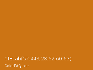 CIELab 57.443,28.62,60.63 Color is a normal orange color and the nearest color is Meteor #d07d12. Hex code #cc7414 and RGB value is rgb(204,116,20). In RGB color space, this color is composed of 80% red, 45% green, 8% blue, In CMYK color space, this color is composed of 0% cyan, 43% magenta, 90% yellow , 20% black , In HSL color space, this color has a hue angle of 31° , 82% saturation and 44% lightness.