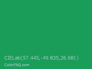 CIELab 57.445,-49.835,26.681 Color is a normal green color and the nearest color is Eucalyptus #278a5b. Hex code #199e59 and RGB value is rgb(25,158,89). In RGB color space, this color is composed of 10% red, 62% green, 35% blue, In CMYK color space, this color is composed of 84% cyan, 0% magenta, 44% yellow , 38% black , In HSL color space, this color has a hue angle of 149° , 73% saturation and 36% lightness.
