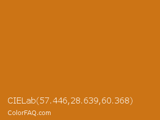 CIELab 57.446,28.639,60.368 Color is a normal orange color and the nearest color is Meteor #d07d12. Hex code #cc7415 and RGB value is rgb(204,116,21). In RGB color space, this color is composed of 80% red, 45% green, 8% blue, In CMYK color space, this color is composed of 0% cyan, 43% magenta, 90% yellow , 20% black , In HSL color space, this color has a hue angle of 31° , 81% saturation and 44% lightness.