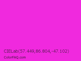 CIELab 57.449,86.804,-47.102 Color is a normal magenta color and the nearest color is Hot Magenta #ff1dce. Hex code #f029de and RGB value is rgb(240,41,222). In RGB color space, this color is composed of 94% red, 16% green, 87% blue, In CMYK color space, this color is composed of 0% cyan, 83% magenta, 8% yellow , 6% black , In HSL color space, this color has a hue angle of 305° , 87% saturation and 55% lightness.