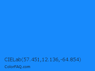 CIELab 57.451,12.136,-64.854 Color is a normal blue color and the nearest color is Dodger Blue #1e90ff. Hex code #178afc and RGB value is rgb(23,138,252). In RGB color space, this color is composed of 9% red, 54% green, 99% blue, In CMYK color space, this color is composed of 91% cyan, 45% magenta, 0% yellow , 1% black , In HSL color space, this color has a hue angle of 210° , 97% saturation and 54% lightness.