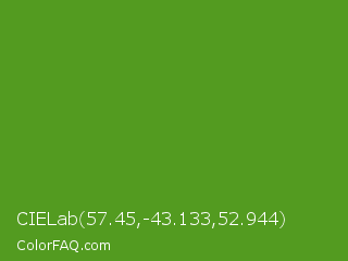 CIELab 57.45,-43.133,52.944 Color is a normal green color and the nearest color is Vida Loca #549019. Hex code #539b20 and RGB value is rgb(83,155,32). In RGB color space, this color is composed of 33% red, 61% green, 13% blue, In CMYK color space, this color is composed of 46% cyan, 0% magenta, 79% yellow , 39% black , In HSL color space, this color has a hue angle of 95° , 66% saturation and 37% lightness.